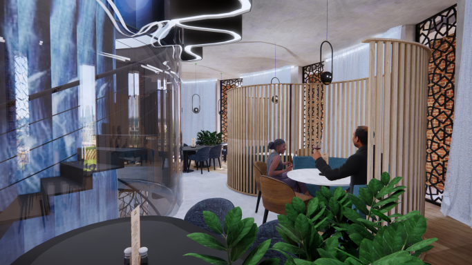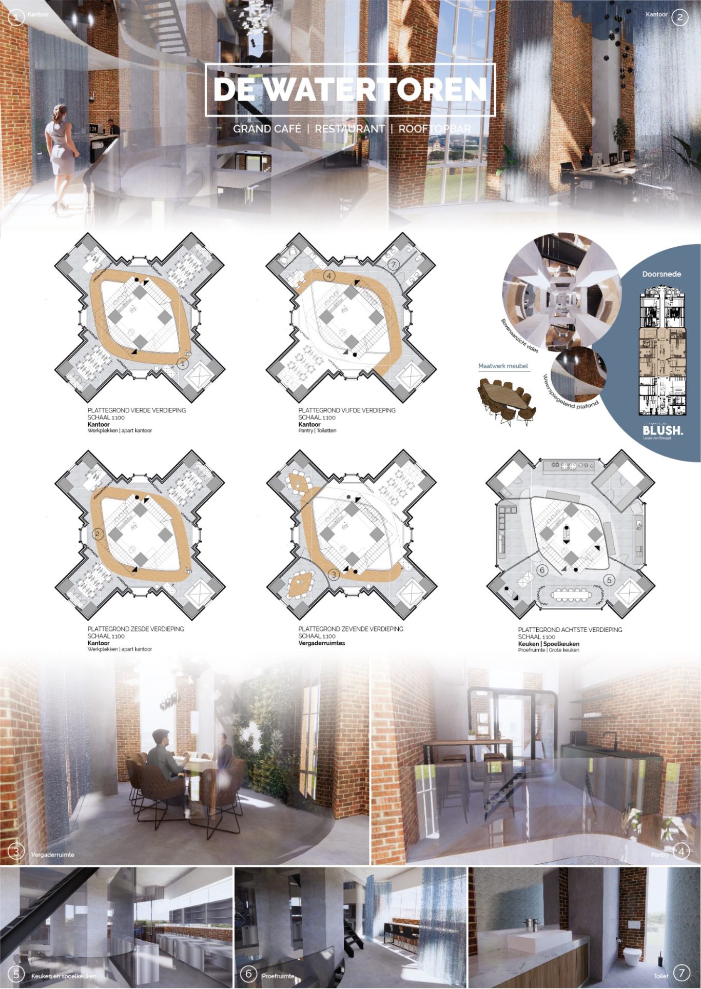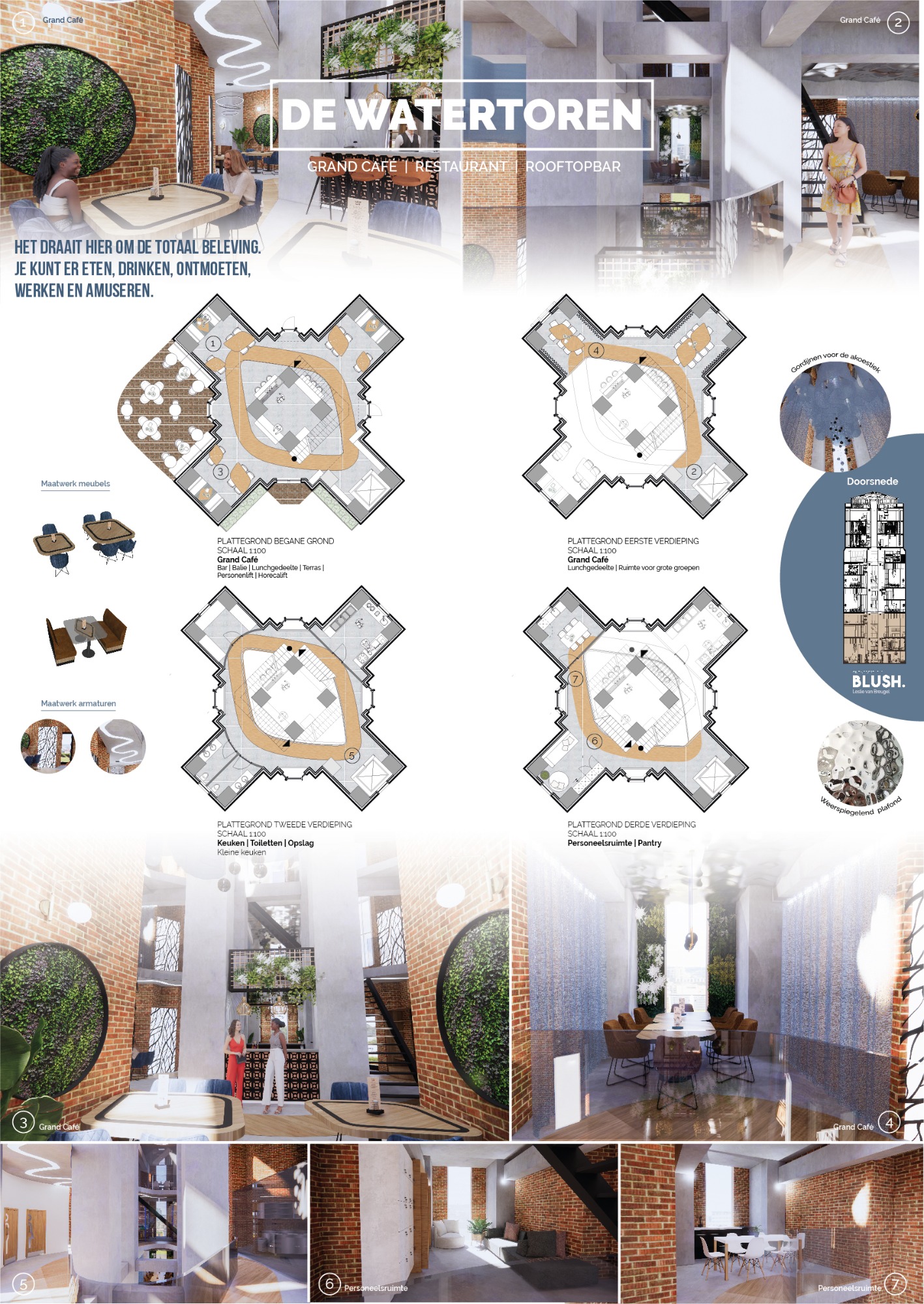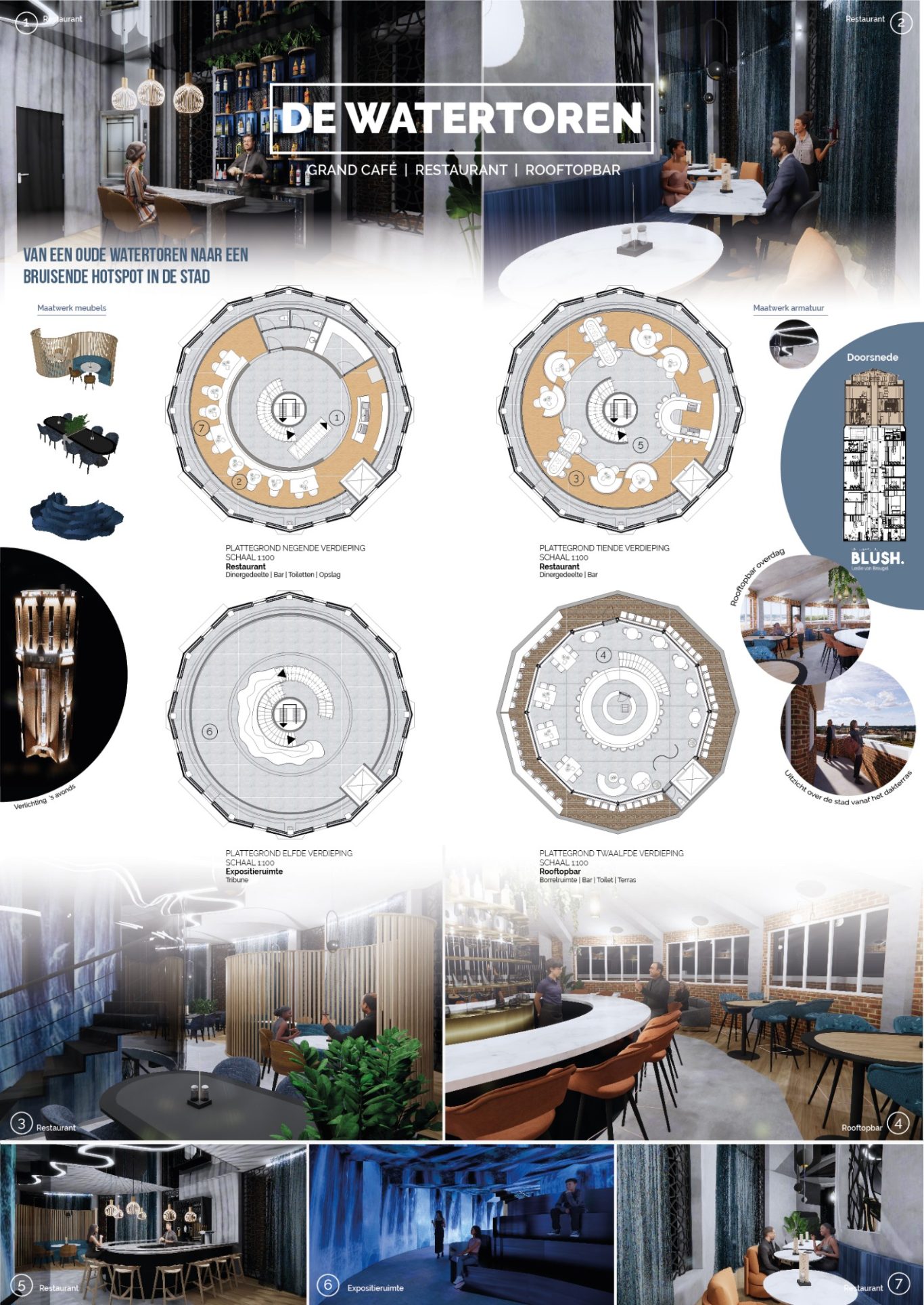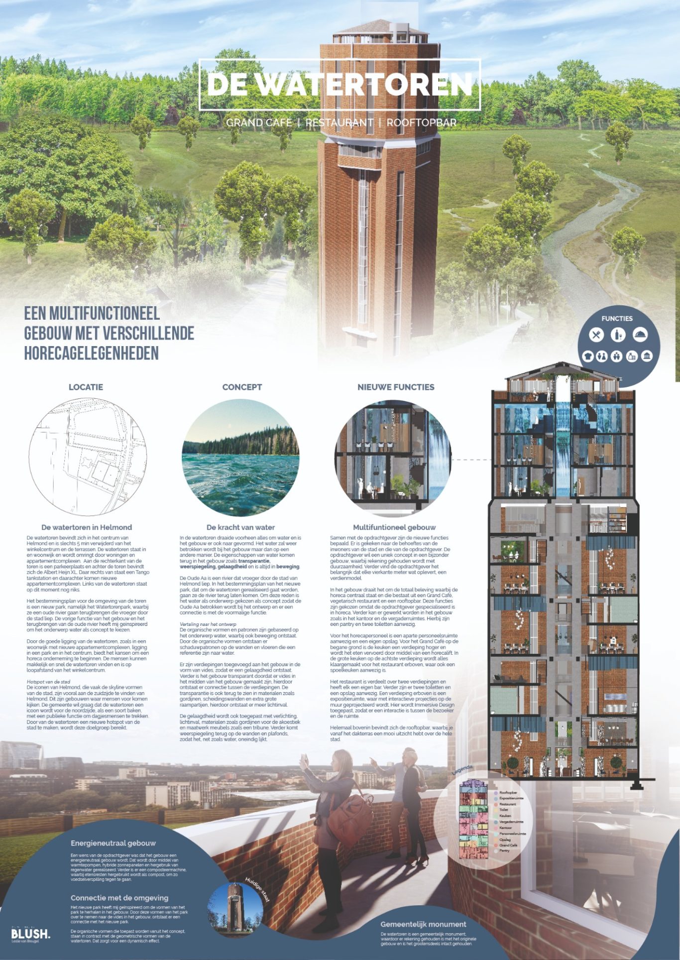 Voor mijn afstudeerproject heb ik een ontwerp voor de watertoren in Helmond gemaakt en een nieuwe herbestemming gegeven. Het is een multifunctioneel gebouw met verschillende horecagelegenheden zoals een Grand Café, restaurant en rooftopbar. Hier draait het om de totaal beleving, je kunt er eten, drinken, ontmoeten, werken en amuseren. Van een oude watertoren naar een bruisende hotspot in de stad.