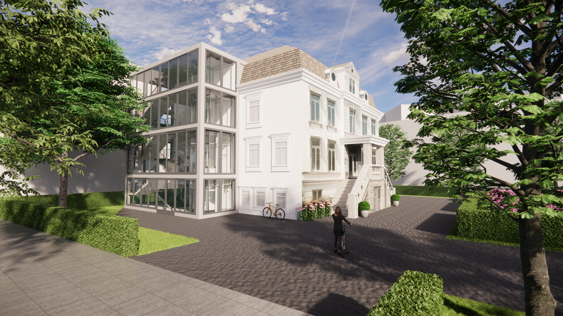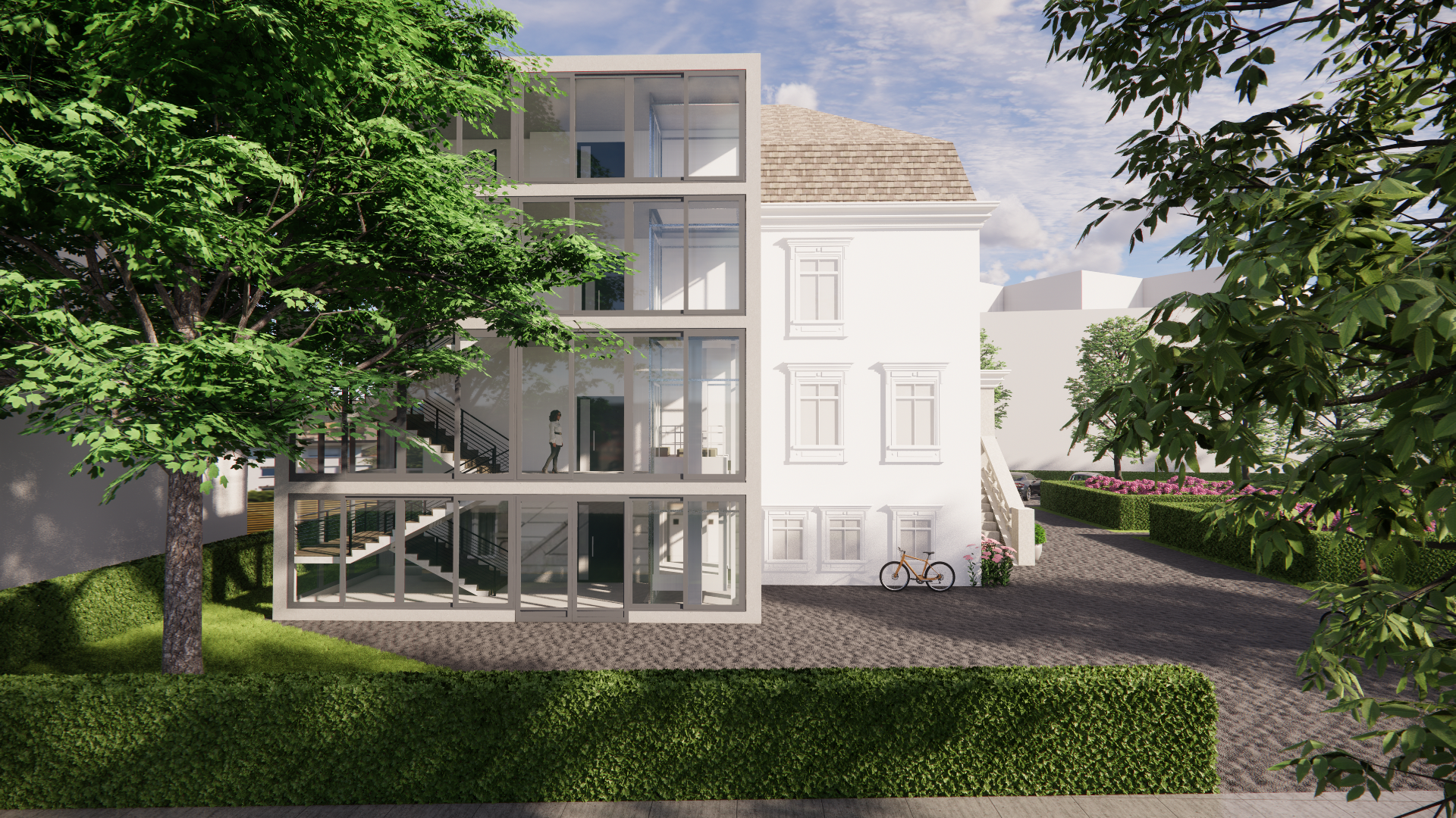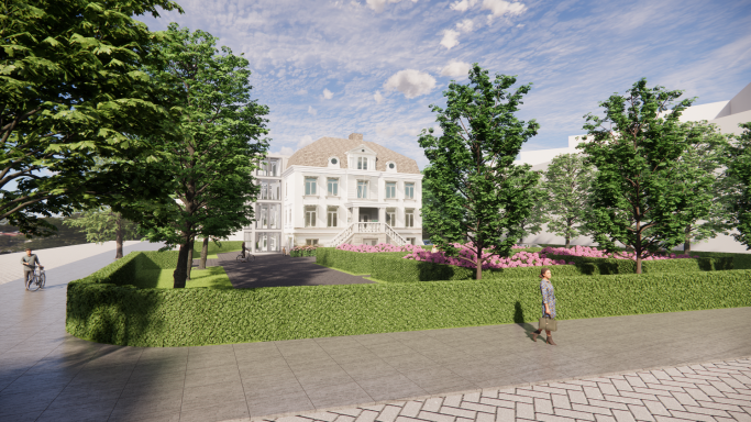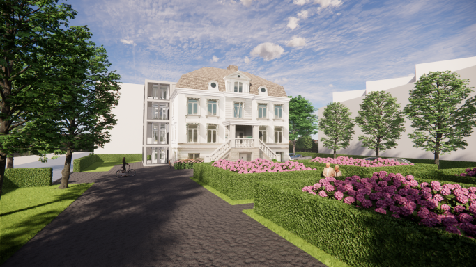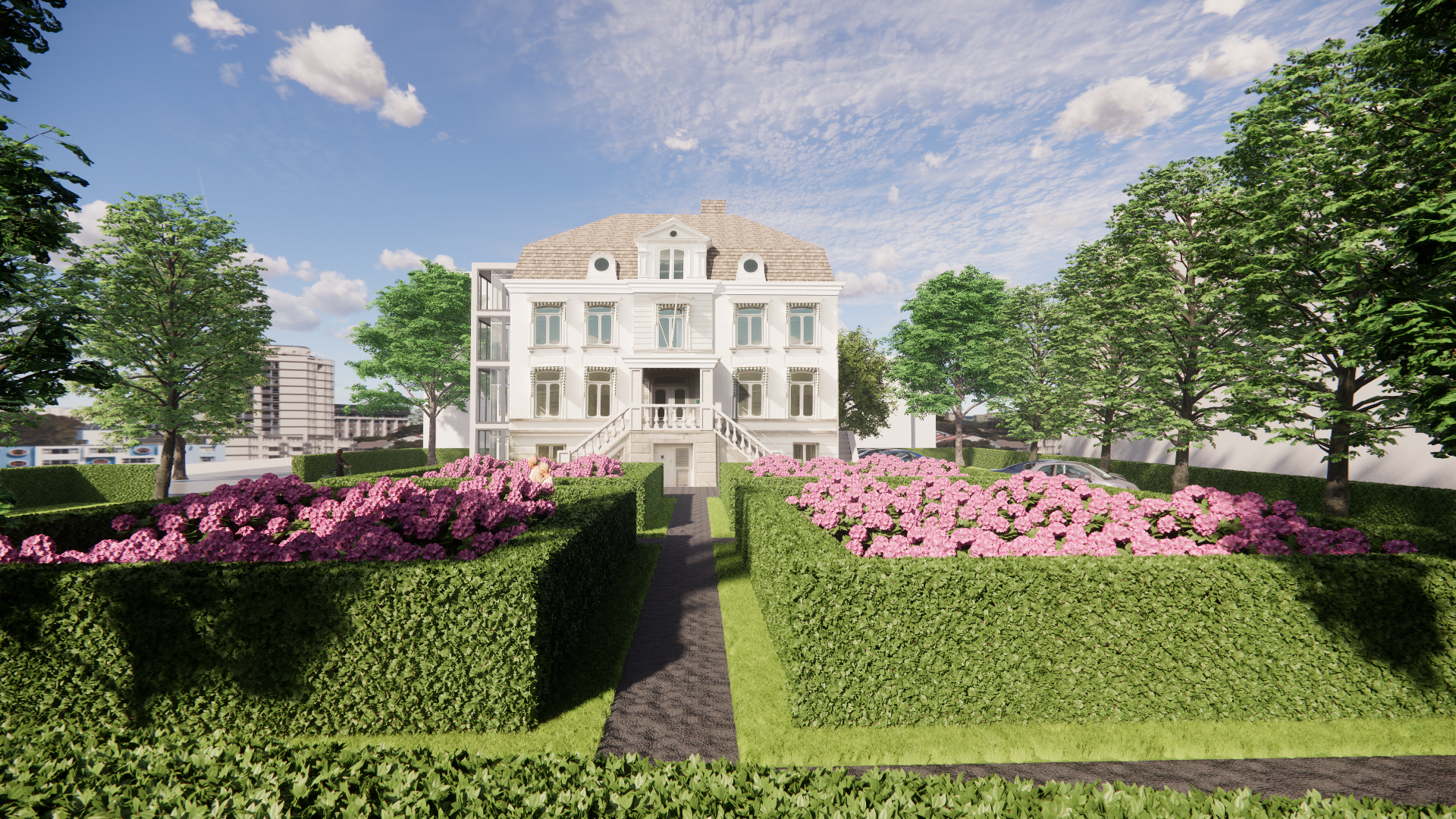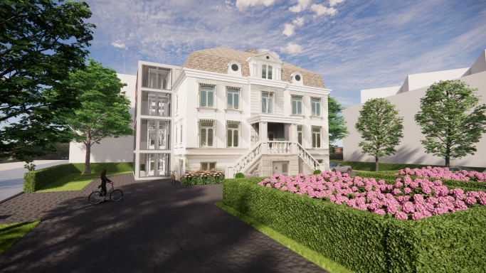 De monumentale villa, omringd door een uitgebreide tuin en voorzien van parkeerplekken, ondergaat een indrukwekkende transformatie naar luxe appartementen met loggia. Een opvallend kenmerk van deze ontwikkeling is de uitbreiding van het gebouw met een elegante glazen trappenhal aan de zijkant van de villa. Deze moderne toevoeging zal niet alleen de toegankelijkheid verbeteren, maar ook een prachtig contrast vormen met de historische architectuur van de villa, waardoor de charme van het verleden wordt gecombineerd met hedendaagse voorzieningen.