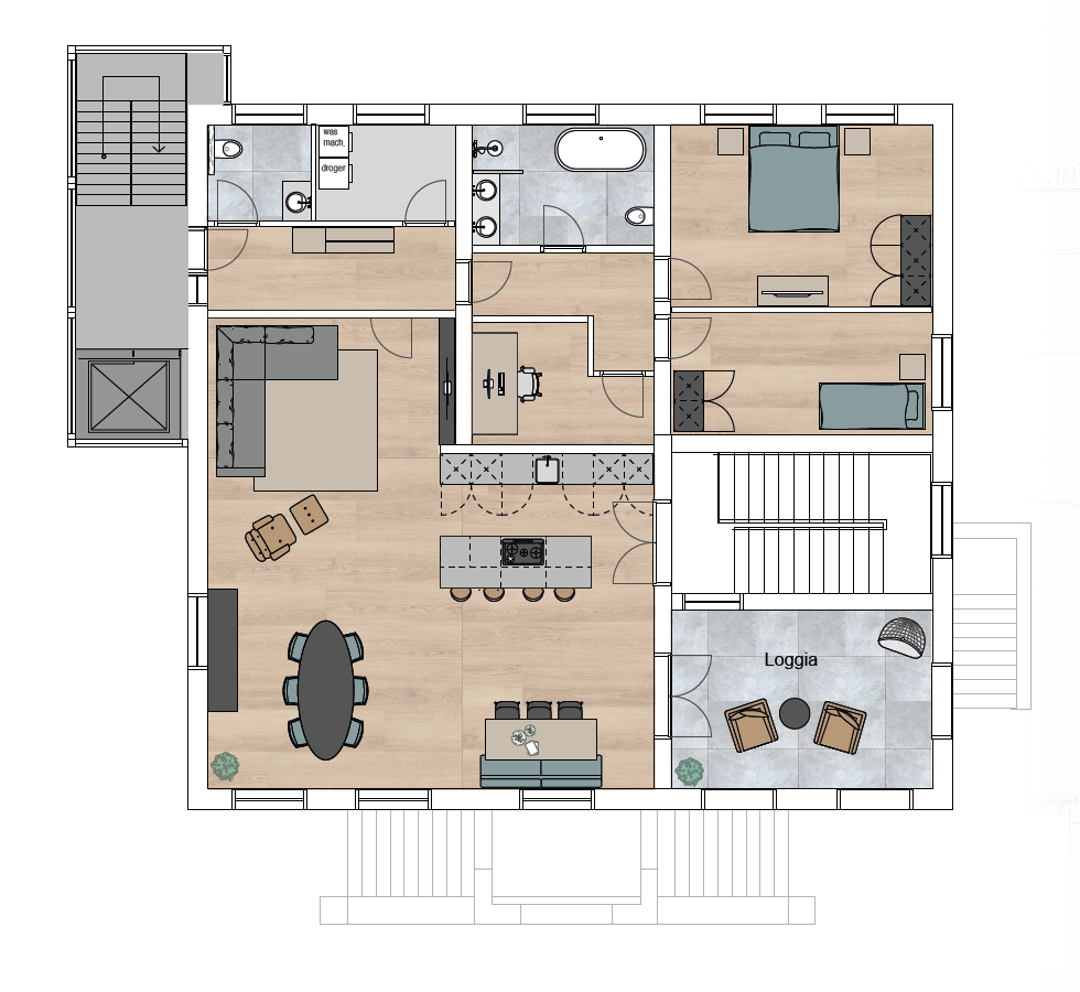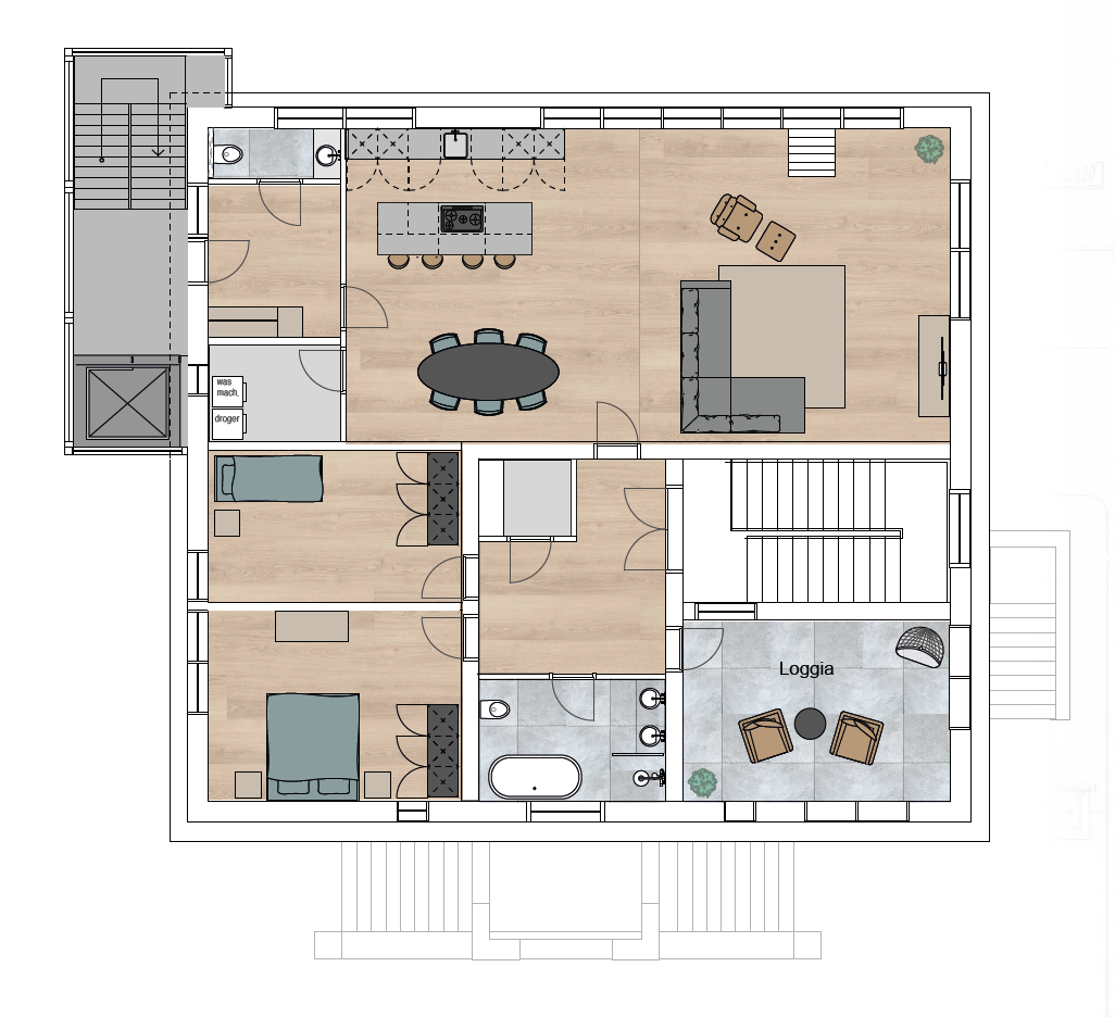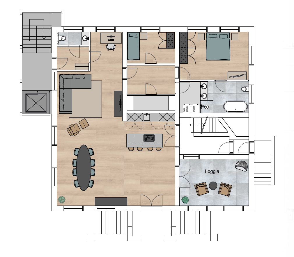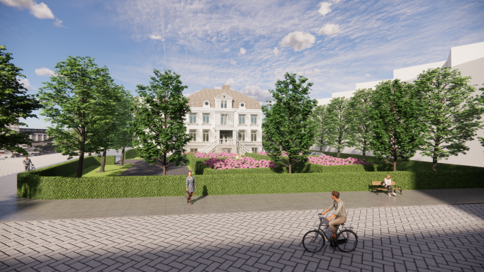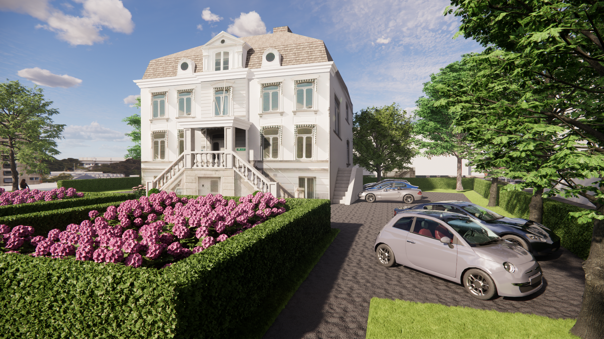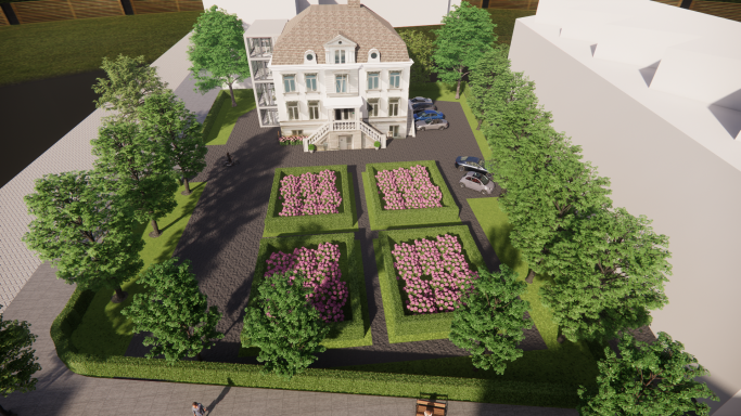 De monumentale villa, omringd door een uitgebreide tuin en voorzien van parkeerplekken, ondergaat een indrukwekkende transformatie naar luxe appartementen met loggia. Een opvallend kenmerk van deze ontwikkeling is de uitbreiding van het gebouw met een elegante glazen trappenhal aan de zijkant van de villa. Deze moderne toevoeging zal niet alleen de toegankelijkheid verbeteren, maar ook een prachtig contrast vormen met de historische architectuur van de villa, waardoor de charme van het verleden wordt gecombineerd met hedendaagse voorzieningen.